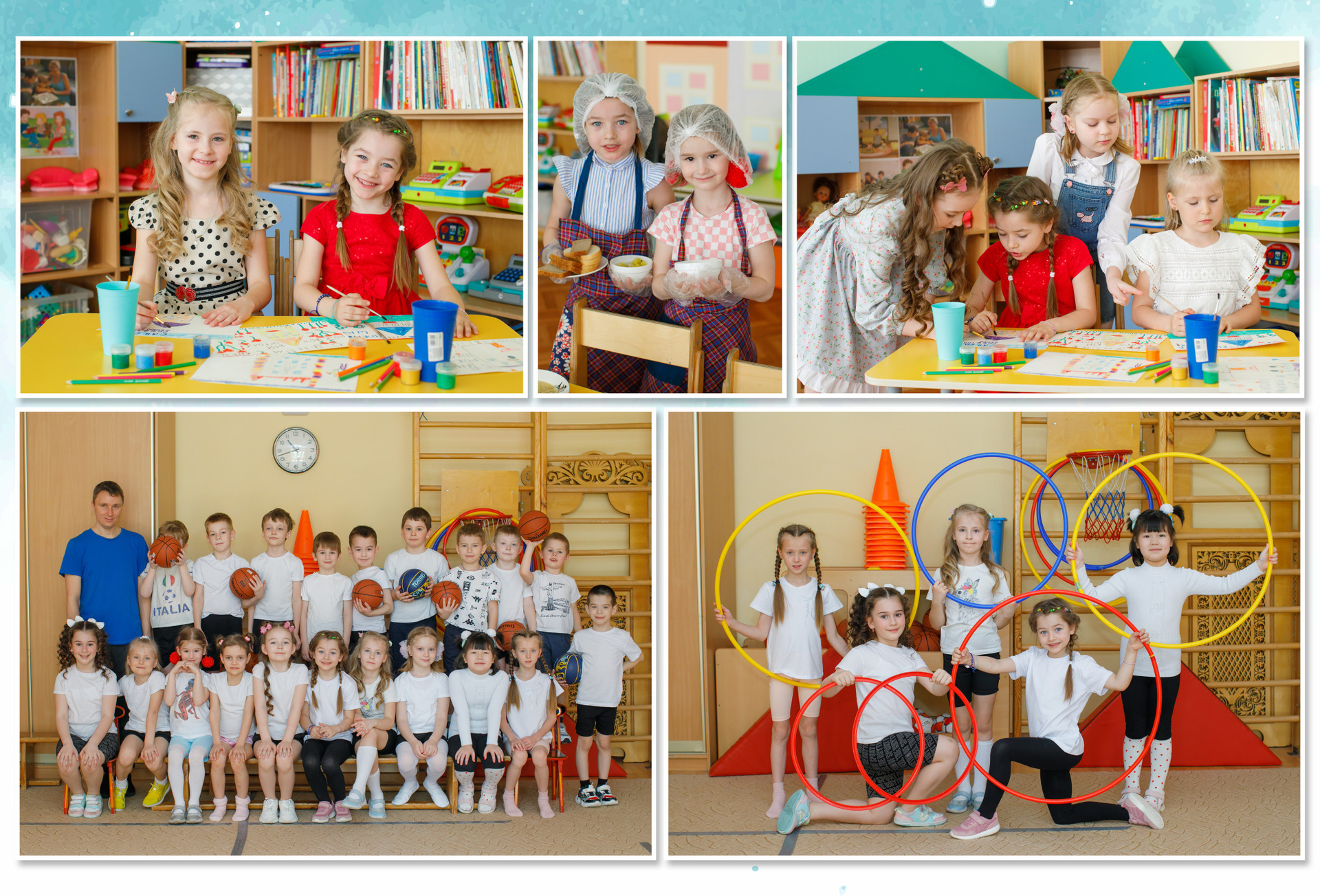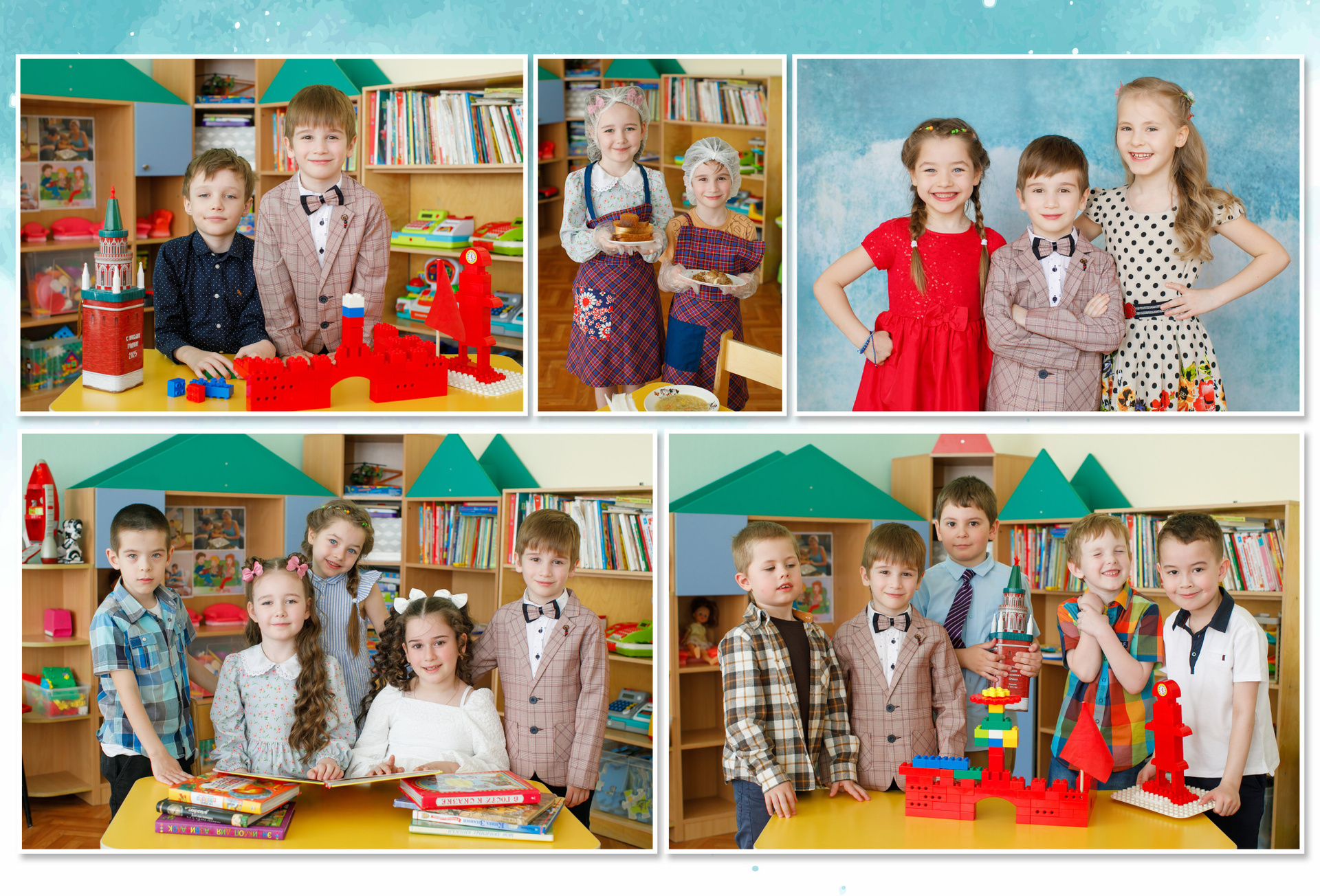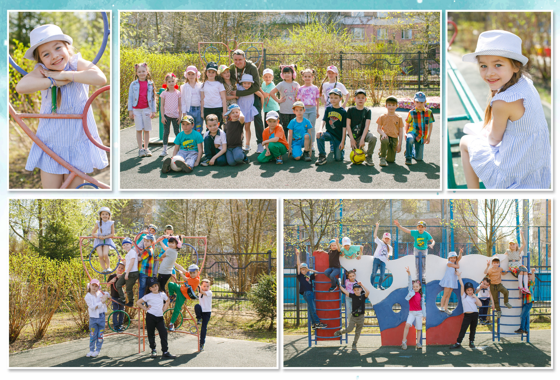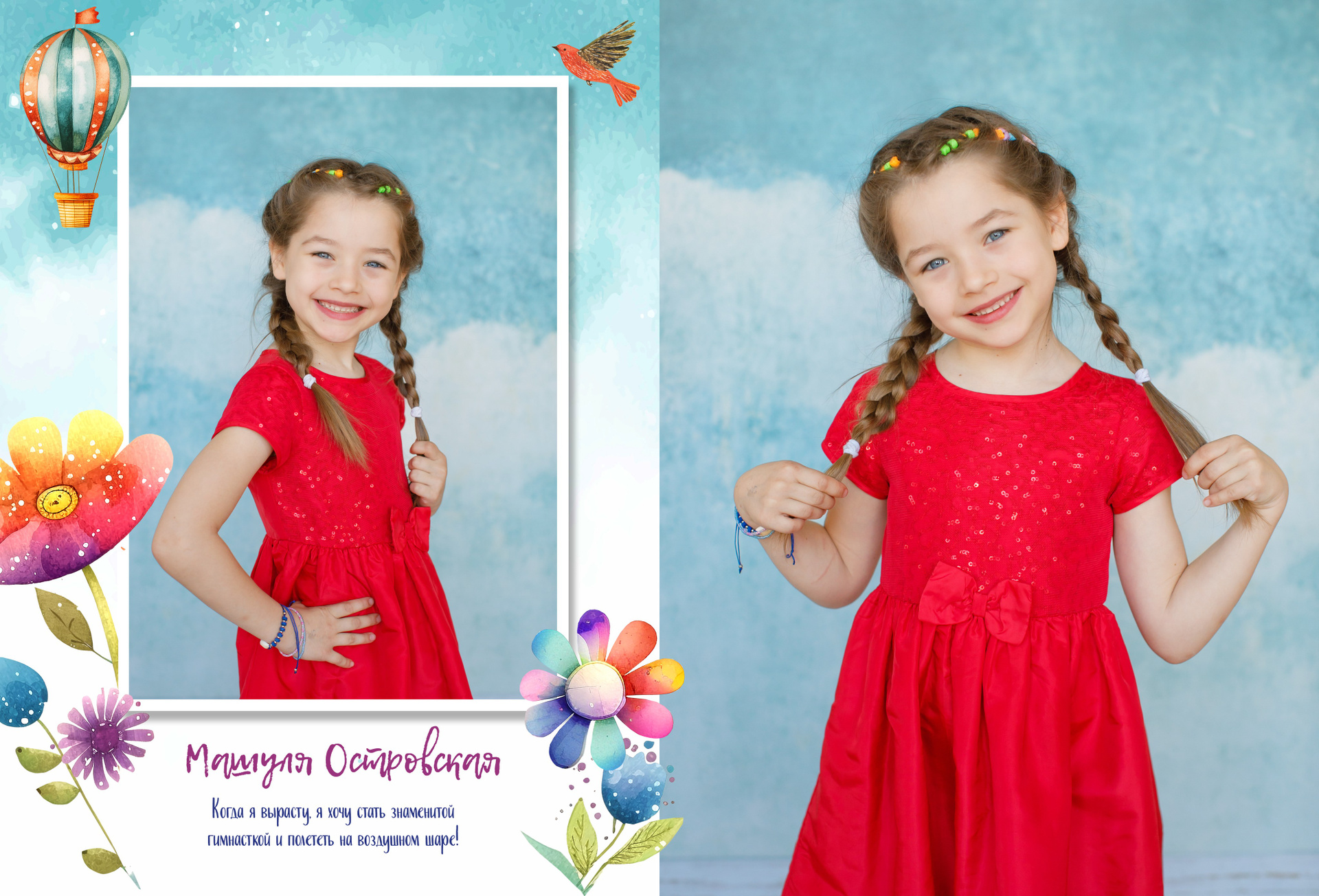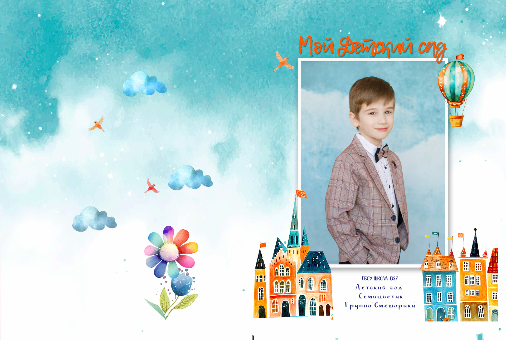 Индивидуальная обложка, 3 личных разворота, 1 разворота виньетки (портреты всех детей и воспитателей).